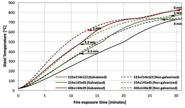 У стандартній пожежі за кривою ISO 834 навіть при локальному нагріві до 520 °C покриття часто зберігає бар’єрну функцію завдяки оксидам та вуглецевому осаду. Повномасштабні тести (зокрема, композитних балок S460M/S690QL) підтверджують: для компактних перерізів гаряче цинкування у поєднанні з оптимальним Am/V утримує температуру сталі нижче 500 °C протягом 25–30 хвилин.
